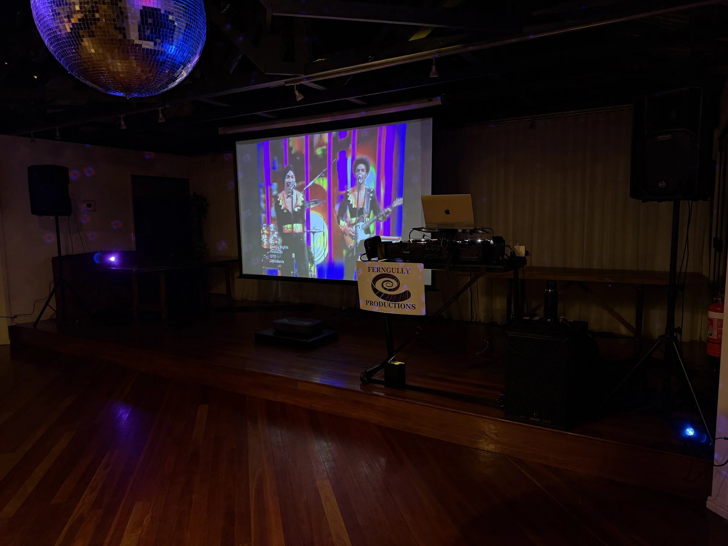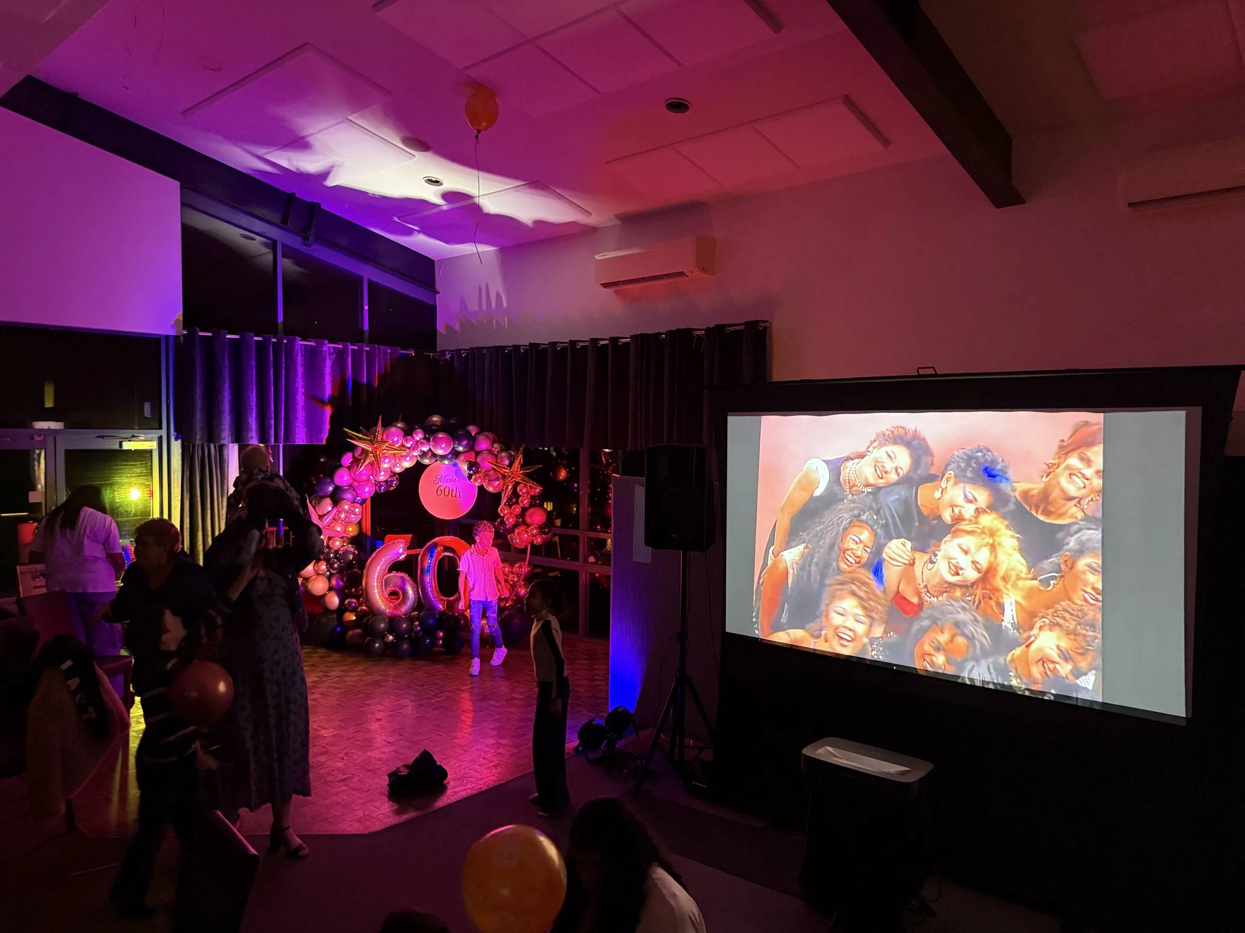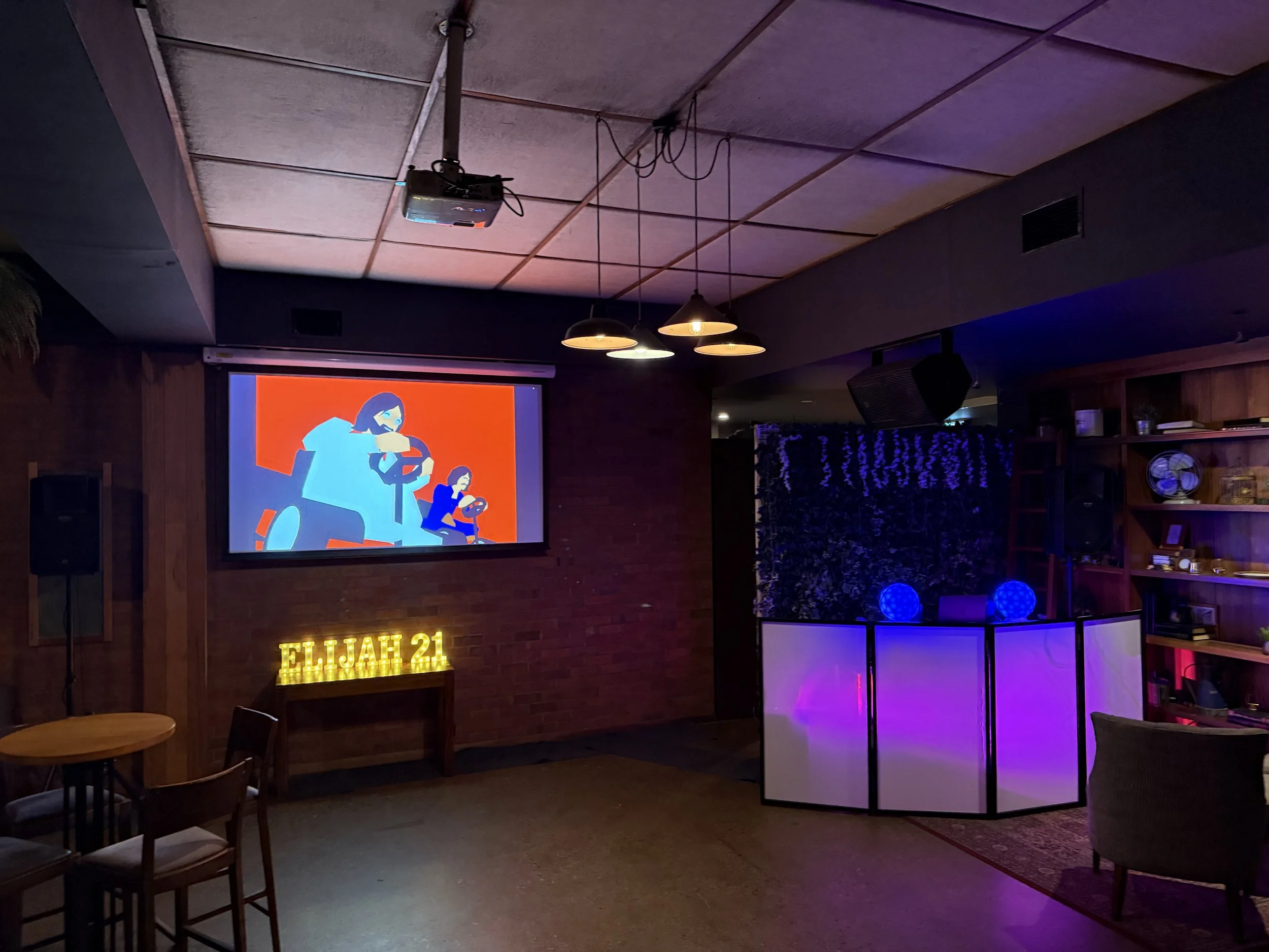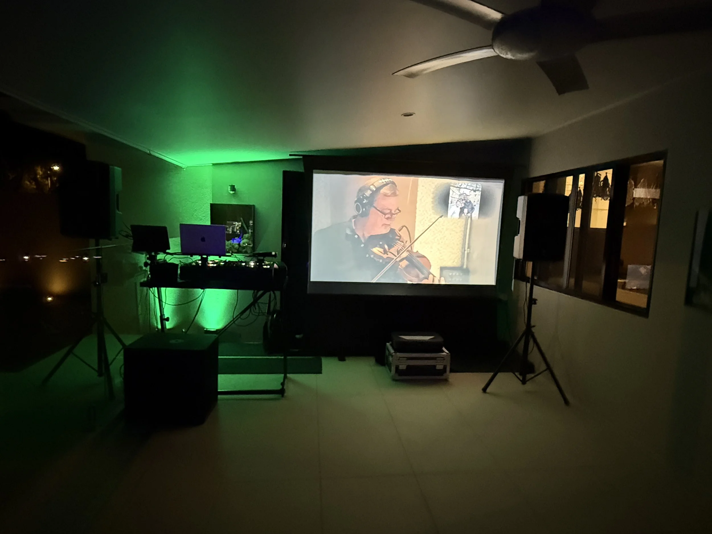 12 inch powered PA speakers, Subwoofer, 100 inch projection screen, projector