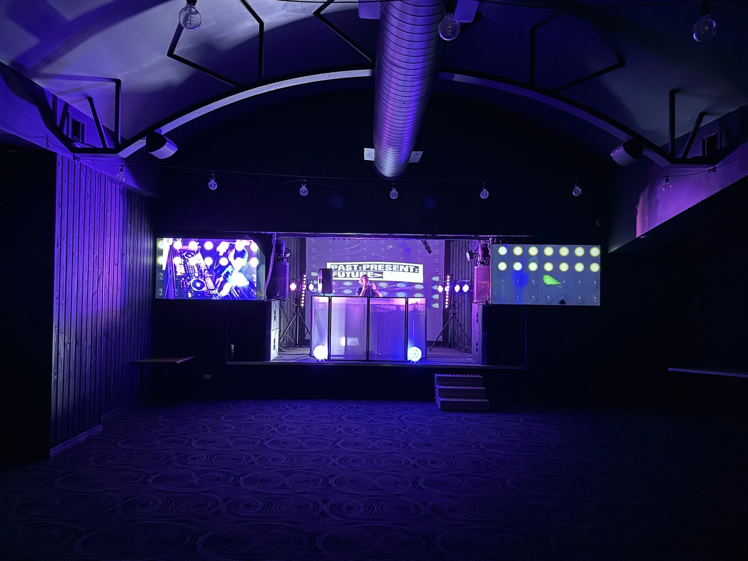 Six speakers, subwoofer, three giant screens, lasers, hazer, moving head dance floor lights, effect lights, uplighting, tree lighting.